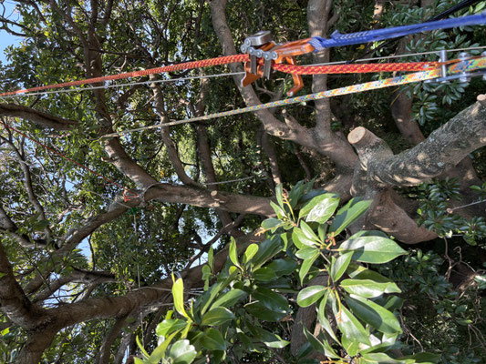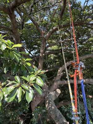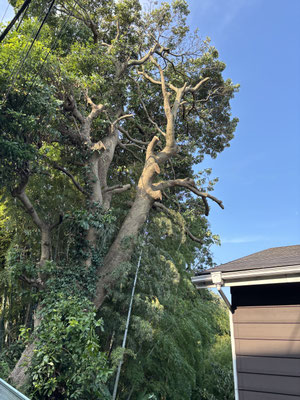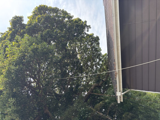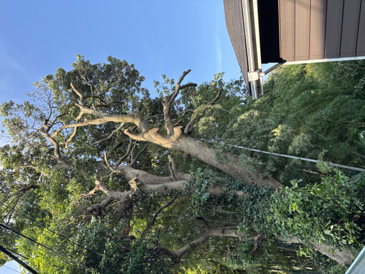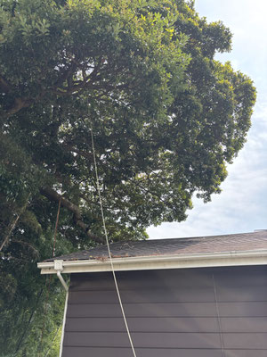 長年屋根に覆い被さるように枝が張り出して日当たりも悪く、落ち葉や実の落下に悩まされていたようです。今回境界まで大きく切り戻しました。